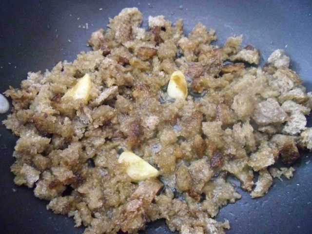 Riducete in briciole una fetta di pane di segale e fatele friggere in un piccolo tegame con dell’olio e i 3 spicchi d’aglio fino a quando non si saranno abbrustolite.