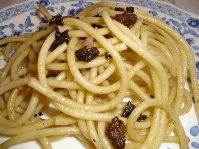 Bucatini con alici di Cetara e pane fritto all’aglio