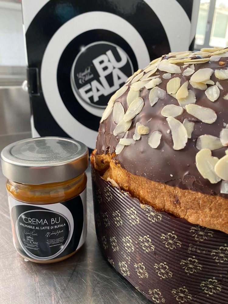 Accompagna il panettone Bufala un vasetto di golosa crema BU (caramello e latte di bufala) che rende la preparazione ancora più irresistibile.