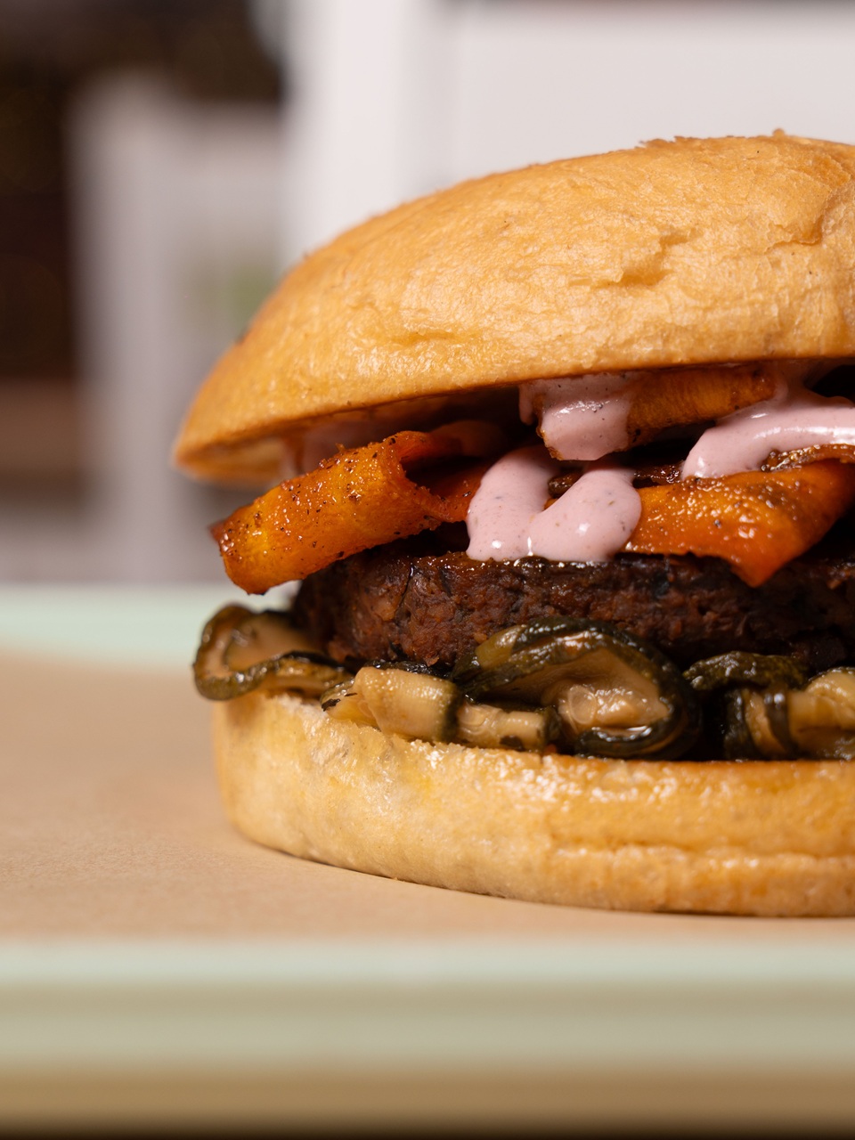Assemblare il panino disponendo alla base le Zucchine alla caprese D’Amico ben scolate dall’olio di conservazione, un burger di funghi, il bacon di carote, disponendolo in modo da creare volume e stando attenti a non schiacciare le carote, e la salsa yogurt alla barbabietola, versata a zig zag. Completare il panino inserendo uno stecchino per mantenere la forma.