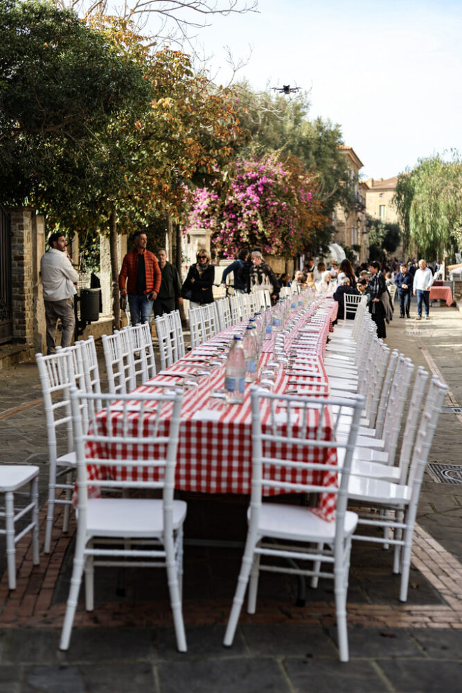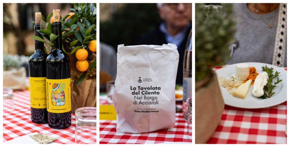 Ad Acciaroli, piccolo e luminoso paese di pescatori della costa occidentale cilentana, si è celebrato il buon compleanno della Dieta Mediterranea. Il borgo si è trasformato in un’unica, immensa sala da pranzo a cielo aperto: una tavolata di oltre 630 posti, allestita nel cuore del paese, tra vicoli bianchi e profumo di salsedine.Persone sconosciute sedute di fianco come vecchi amici.
