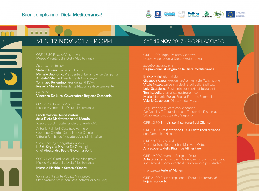 Il primo appuntamento è per venerdì 17 novembre alle ore 18:30 presso Palazzo Vinciprova, sede del Museo Vivente della Dieta Mediterranea di Pioppi, cuore pulsante dell’iniziativa. Interverranno Rossella Muroni, Presidente nazionale di Legambiente; Vincenzo De Luca, Governatore della Regione Campania; Stefano Pisani, sindaco del Comune di Pollica; Tommaso Pellegrino, Presidente del Parco Nazionale del Cilento, Vallo di Diano e Alburni; Aristide Valente, Presidente di Alma Seges e Michele Buonomo, Presidente di Legambiente Campania. L’incontro proseguirà alle ore 20:30 con la proclamazione dei nuovi Ambasciatori della Dieta mediterranea nel mondo: Antonio Palmieri (Caseificio Vannulo), Giuseppe Cilento (Coop. Nuovo Cilento) e Vittorio Rambaldo (pescatore Alici di Menaica). Alle ore 21:30 inizierà lo spettacolo “Serata d’onore” con Michele Placido. Durante la serata spazio anche a degustazioni e showcooking con gli chef Alessandro Feo e Giovanna Voria e i maestri pizzaioli della Pizzeria Da Zero. Nella spiaggia antistante Palazzo Vinciprova, si potranno osservare le stelle con l’Associazione Astrofili di Aielli (Aq).