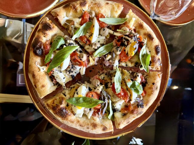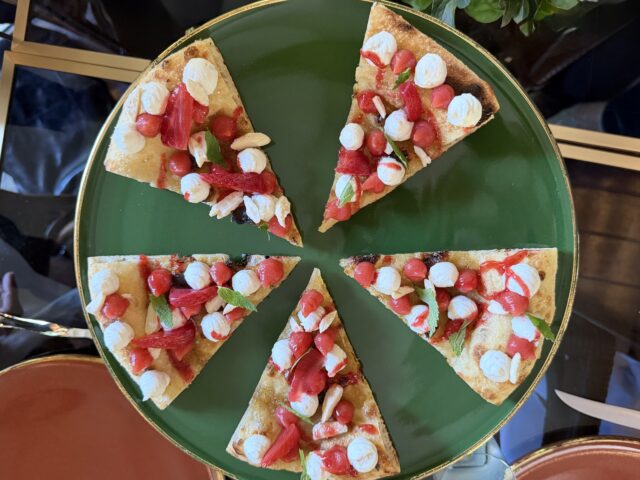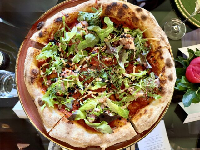Il menu prevede otto pizze, tra grandi classici e creazioni originali: dalla Margherita DOP a proposte come “Variazione di Zucchine”, “Indiavolata”, “Formaggi e Limone”, fino alla “Crudo di Gambero”, al “Cocktail di Gamberi” e alla “Super Capricciosa”, oltre a incursioni nel mondo dessert come la pizza “Fior di Fragola”. Topping che guardano l’alta cucina, che valorizzano ingredienti italiani, giocando su texture ed equilibrio.