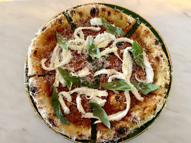 Margherita DOP: pomodoro San Marzano arrostito, treccia di fior di latte, parmigiano reggiano 30 mesi, basilico mix pepi
