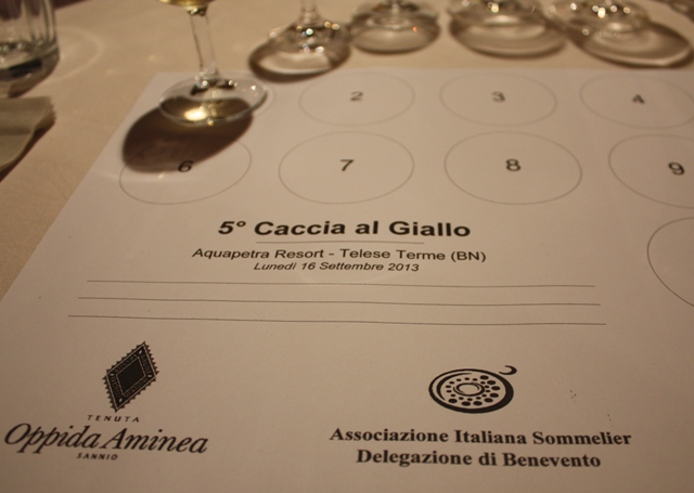 Questo ed altro è stata la quarta edizione della ‘Caccia al Giallo’ che l’azienda organizza in collaborazione con la delegazione sannita dell’Ais. Un’edizione che ha lasciato i filari di Oppida Aminea alla contrada Eremita di Benevento per spostarsi tra le mura dell’Aquapetra Resort immersa nel verde di monte Pugliano. Location ideale per la formula che si è voluta dare al gioco didattico di quest’anno, che doveva avere una guida di eccezione nella presenza del sommelier campione del mondo Luca Gardini, alla fine trattenuto lontano da Telese Terme per motivi familiari. L’enologo dell’azienda, il poliedrico Francesco Iacono, ha brillantemente condotto la “caccia”, che come al solito vedeva i numerosi partecipanti (oltre cinquanta) impegnati a portare in alto il nome di un tipico vitigno bianco campano.