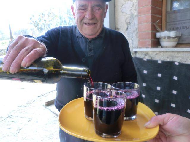 Per la strada Zi Felice ci porge un bicchiere del suo vino, misto di sciascinoso misto ad altre uve.