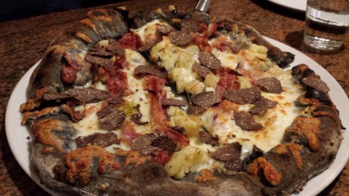 All’impasto, preparato con farina 00 e Manitoba, è aggiunto il carbone vegetale. Questi gli ingredienti per la guarnizione: patate di montagna cotte sotto la cenere, guanciale, scamorza di Caggiano e tartufo nero fresco, un pizzico di sale e olio extra vergine di oliva.