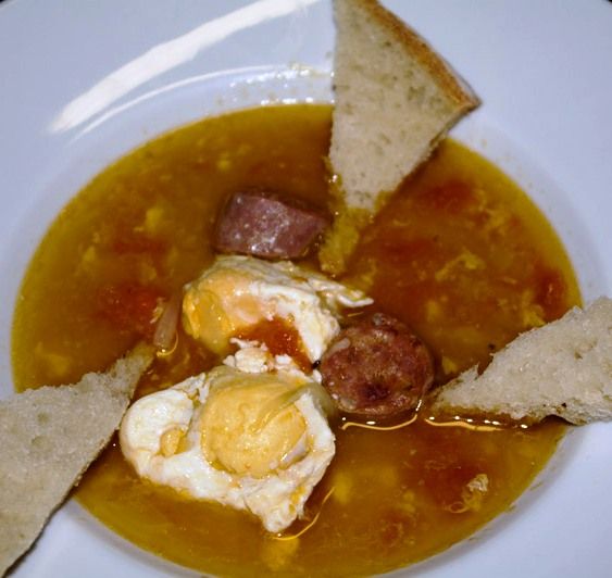 Procedimento: far soffriggere (in olio extra vergine di oliva) la cipolla fresca tagliata sottile. Quando la cipolla è appassita, aggiungere la salsiccia di maiale nero tagliata a rondelle e lasciar cuocere per circa 5 minuti. Dopo avervi la scorza di formaggio e 2-3 mestolini di acqua calda e i pomodorini (in precedenza sbollentati per circa 30 secondi in acqua bollente e immersi in acqua fredda e ghiaccio per essere privati della buccia). Lasciar cuocere per circa 5 minuti prima di aggiungere ½ litro di acqua calda e il sale marino siciliano grosso. Dopo altri 5 minuti di cottura aggiungere le uova e ultimare la cottura per altri 5 minuti. Servire con crostini di pane.