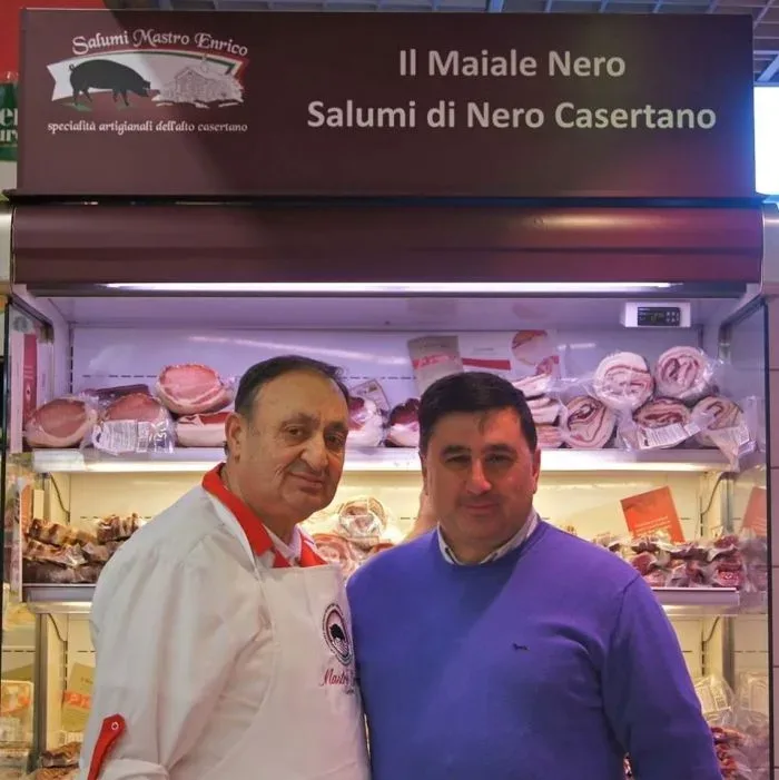 Salumi Mastro Enrico, da sx verso dx Mastro Enrico e Antonino Iacoessa 2/12/2014 Torna a: Caiazzo, salumi artigianali di maiale nero casertano Mastro Enrico Salumi Mastro Enrico, da sx verso dx Mastro Enrico e Antonino IacoessaSuccessiva →