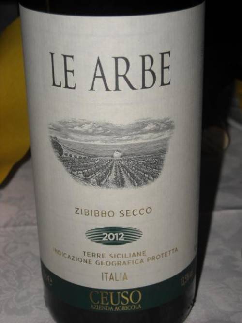 Ci siamo divertiti ad abbinare uno Zibibbo secco dell’Azienda agricola Ceuso di Alcamo, annata 2012. E’ la prima vendemmia che finisce in bottiglia. Da un vigneto davvero suggestivo che guarda il mare di Scopello, impianto del 2007, è un bianco giovane, socievole ed elegante, attacco fruttato dallo spettro ampio, con quella caratteristica nota del vitigno aromatico, su un gradevolissimo sfondo sapido-minerale davvero interessante, e una beva facile e piacevole. La sua piacevolezza ed eleganza ci ha permesso di trattare l’antipasto come se fosse un divertente aperitivo.