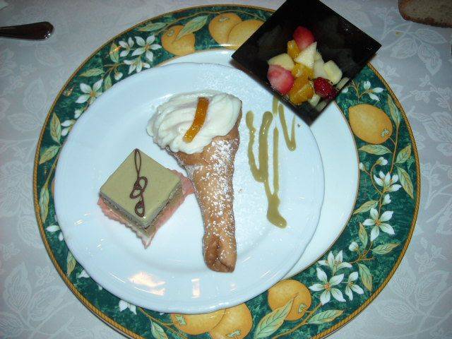 Quadratino al pistacchio e cornucopia di cannolo con ricotta grezza e canditi della Pasticceria MOZART e insalata di frutta a chiusura