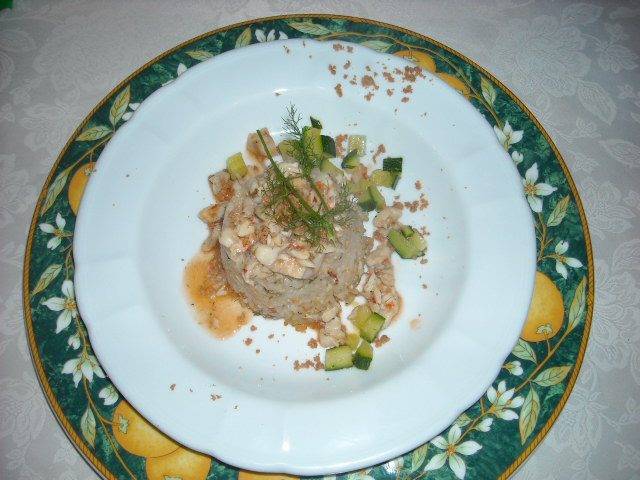 Tortino di riso alle triglie di scoglio e finocchietto selvatico, sabbiato alla bottarga di tonno e concassé di zucchine