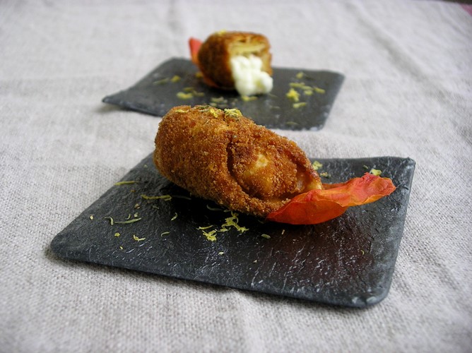 Scolarle su cartapaglia e servire le carrozze di calle e mozzarella ben calde, decorate con i petali di buccia di pomodoro essiccata, un pizzico di origano e una grattatina sottile di scorza di limone.