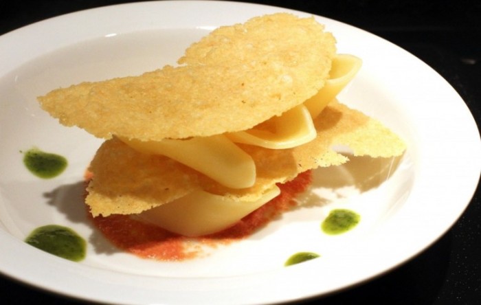 Procedere all’impiattamento svirgolando sulla base il pomodoro e sopra di esso costruire una torre alternando uno strato di pasta con 1/2 cialda di Parmigiano. Chiudere con la 1/2 cialda e terminare la decorazione con la crema di basilico.