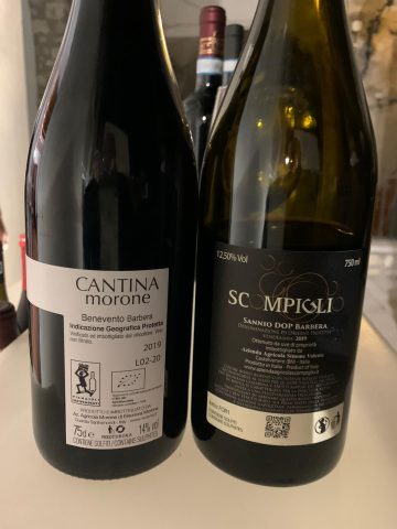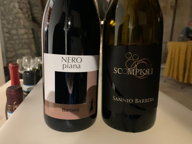 Presentiamo le etichette. I vini degustati sono stati il Sannio Dop Barbera dell’azienda Scompiglio di Castelvenere e il Beneventano Igp Barbera NeroPiana di Cantina Morone di Guardia Sanframondi. Due piccole realtà le cui radici affondano da sempre nell’agricoltura e che in quest’ultimo periodo si sono ben attrezzate anche per l’ospitalità. Tante differenze nei calici, tenute insieme da un saldo filo conduttore: l’immediata riconoscibilità del vitigno. Le etichette sono entrambe della vendemmia 2019, a ricordarci che questo vino va bevuto giovane per godere pienamente delle sue peculiarità.