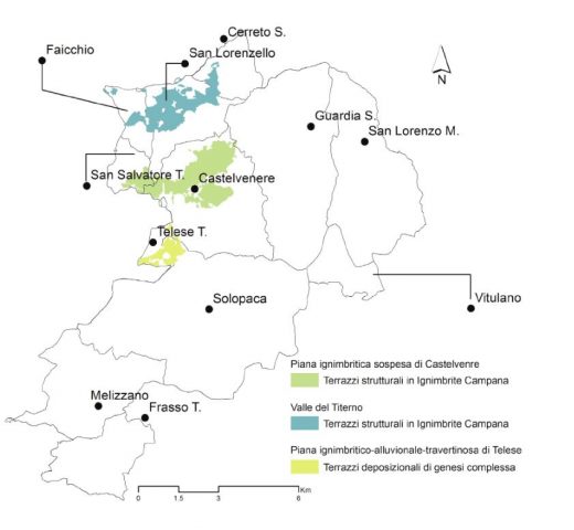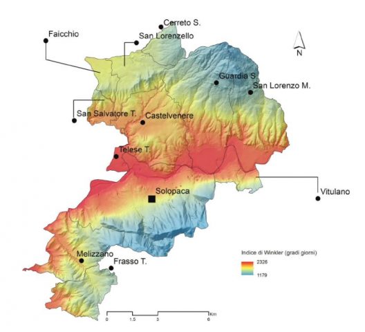 Se l’andamento di entrambi i terreni è pianeggiante, notevole è l’incidenza del sole sulle vigne. Particolarmente consistente, infatti, la differenza dell’indice di Winkler che si registra nelle due aree (l’indice rappresenta la somma di tutte le temperature medie giornaliere nel periodo vegetativo della vite, fino alla sua maturazione e raccolta), con la Piana che raggiunge un indice di circa 2.400 gradi/giorni rispetto ai circa 2.000 della località castelvenerese. Altra caratteristica da sottolineare sono le escursioni termiche estive, in alcuni periodi più consistenti nei terreni posti più a valle (quindi quelli telesini e amorosini), anche per motivi legati all’assenza di vento, quest’ultimo quasi sempre presente alla località Scompiglio, che deve il suo nome proprio all’azione di Eolo. Del resto, sono proprio queste condizioni climatiche che hanno favorito la particolare diffusione del vitigno – caratterizzato da una gemmazione tardiva (con maggiore possibilità di difendersi dalle gelate della tarda primavera) e da una maturazione precoce – proprio sulla Piana di Telese.