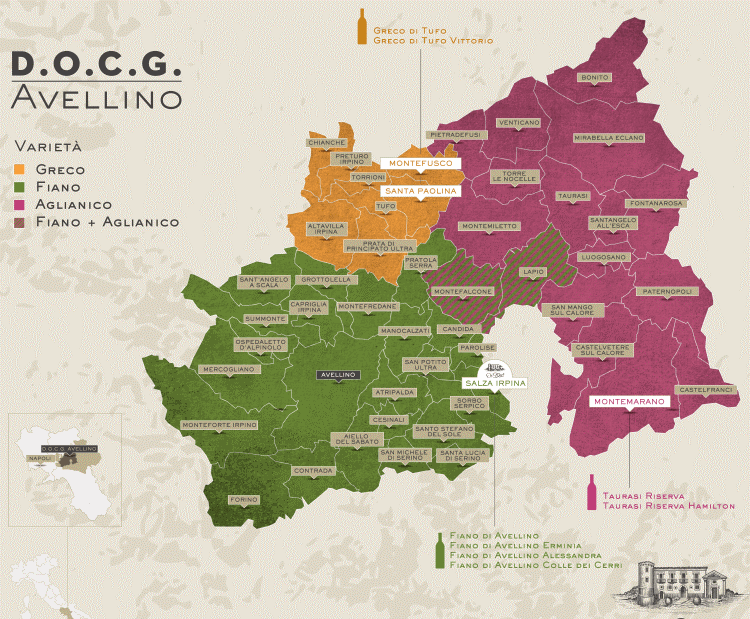 Nella mappa che segue si ha una visione d’assieme e si può notare come due comuni, Montefalcione e Lapio, fanno parte di due DOCG: Fiano e Taurasi.