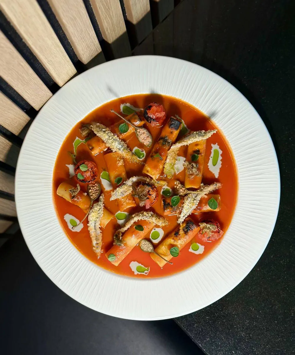 Scolare le alici sott’olio e panarle nel crumble di pizza bianca; Impiattare la pasta, insieme al fondo di pesce al pomodoro e adagiarvi le alici al di sopra. Unire i pomodorini confit e il concassé di pomodoro in maniera omogenea, accanto alle candele e alle alici. Guarnire il piatto con la crema di alici alla brace, la crema di pomodorino datterino e l’olio all’origano. Concludere con i capperi fritti, i cucunci e origano fresco.