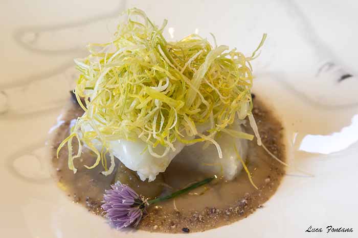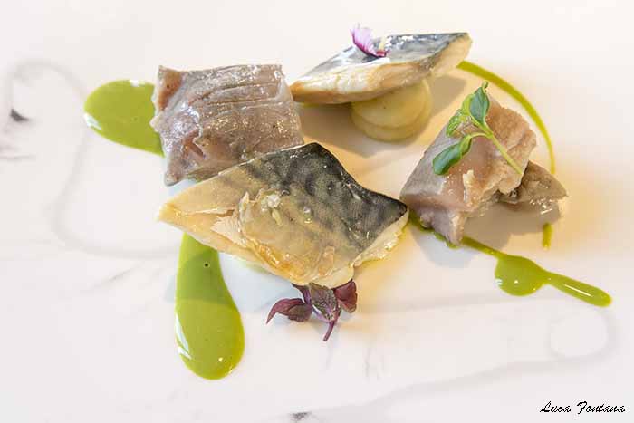 Testina di vitello cotta a bassa temperatura e sgombro con salsa verde di sedano. Una portata decisamente impegnativa, dove terra e mare si incontrano. Il risultato finale è una degna conclusione del comparto salato della cena.