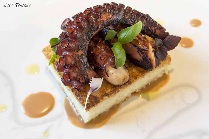 Polpo con tegola di riso al latte di capra e salsa alla Luciana. Il polpo è cucinato perfettamente, con una tegola croccante fuori ed avvolgente dentro. Pensando alla rotondità della cucina sopra citata, questo antipasto è quello che meglio la rappresenta. Da notare la “mano dello chef”, stampata su tutti i piatti.