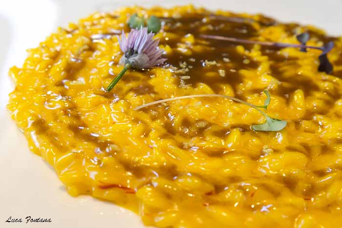 Risotto allo zafferano, midollo di bue e gremolada di limone. La cottura è eccellente, con la scelta di una grande mantecazione che lascia tuttavia il chicco definito e consistente. Interessante la scelta del limone, che fornisce il giusto mordente ad un classico altrimenti un po’ spento.