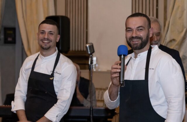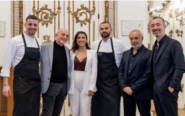 A guidare gli ospiti in un racconto coinvolgente e ricco di aneddoti – anche legati alla dimensione più privata e familiare della cantina – è stata Claudia Barbarito, che ha trasformato la degustazione in una narrazione emozionale e autentica. La serata si è aperta con un aperitivo giro braccio curato dallo Chef del Brancaccio Simone Di Tullio, accompagnato da Roesia Metodo Classico Rosé Pas Dosé Cantele, elegante e fine nelle sue bollicine, e da VSQ Pas Dosé Negroamaro Cantele, espressione contemporanea di uno dei vitigni simbolo del territorio, introducendo gli ospiti ai profumi e all’identità enologica salentina. A seguire, arrivati direttamente da Lecce gli Chef Simone De Siato e Chef Simone Centonze, insieme alla loro brigata Chiara Rizzo e Matteo Parlangeli hanno firmato un percorso gastronomico interamente ispirato alla tradizione pugliese, valorizzando ingredienti identitari e memoria contadina. L’antipasto – cilindro di pan cotto con ceci e mugnuli, cardoncelli in doppia consistenza e caramello di funghi – ha celebrato la valorizzazione degli ingredienti poveri, trasformando la tradizione rurale in una proposta elegante e contemporanea, in abbinamento a IGP Puglia Verdeca CNTL, vino fresco e minerale capace di esaltare le note vegetali e la delicatezza del piatto. Il primo piatto, tagliatella mantecata con cacio di pecora moscia leccese, essenza di foglie di limone, limone bruciato e pepe, ha raccontato una reinterpretazione territoriale della cacio e pepe, giocando sull’equilibrio tra sapidità e freschezza aromatica. La pasta utilizzata è quella dello storico Pastificio Benedetto Cavalieri, che ha scelto di sostenere l’iniziativa omaggiando le proprie tagliatelle, simbolo di eccellenza pugliese e qualità artigianale. Fondamentale la presenza del raro pecorino della Masseria Pascarito di Maglie, presidio di autenticità e tradizione casearia salentina, ingrediente che ha conferito profondità e identità al piatto. Il piatto è stato accompagnato da Teresamanara IGP Salento Chardonnay Cantele, vino avvolgente e strutturato, capace di sostenere la cremosità della mantecatura con eleganza. Momento particolarmente intenso della serata è stato il secondo piatto: la bombetta della tradizione, omaggio alla cucina di brace e alla memoria familiare, servita in abbinamento ad Amativo IGP Salento Cantele, blend di Primitivo e Negroamaro, vino potente ma armonico, capace di dialogare con la succulenza e la complessità del piatto. Nel raccontarla, lo chef ha condiviso parole che hanno emozionato la sala: “Il lento risveglio della domenica mattina aveva l’odore del caffè e il profumo del ragù di mamma: bastavano quelli a ricordarti dove fosse casa.” Un passaggio che ha trasformato il piatto in un viaggio nella memoria collettiva del Sud. Il percorso si è concluso con il dessert – bavarese al mustazzolo, sablé alle cinque spezie, salsa al Negroamaro e gelato alla cupeta – evocazione dei sapori delle feste e della tradizione salentina. A suggellare il dialogo tra vino e cucina del territorio, il momento conviviale dedicato al libro di Antonella Amodio, dedicato all’abbinamento tra vino e pizza: un gesto simbolico che ha voluto sottolineare come questo evento rappresenti il primo passo di un percorso in cui il vino pugliese incontra direttamente i piatti della sua terra, preparati da chef che ne sono espressione autentica. Con questa serata il Club Cristal conferma la propria identità: eventi fortemente legati alla cultura del vino, capaci di evolversi e creare nuove esperienze in cui territorio, racconto e cucina dialogano con coerenza e profondità.