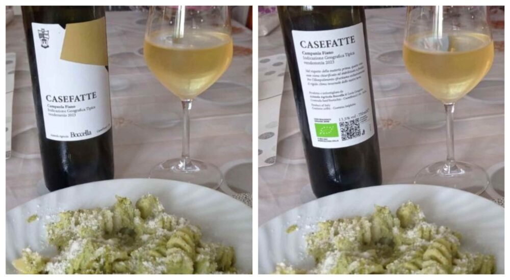 Casefatte Fiano Campania Igt 2023. Fiano vendemmiato a settembre. Maturazione in legno per tre mesi e poi affinamento in vetro per due mesi. Gradazione alcolica di tredici e mezzo. Prezzo finale di 20,00 euro.
