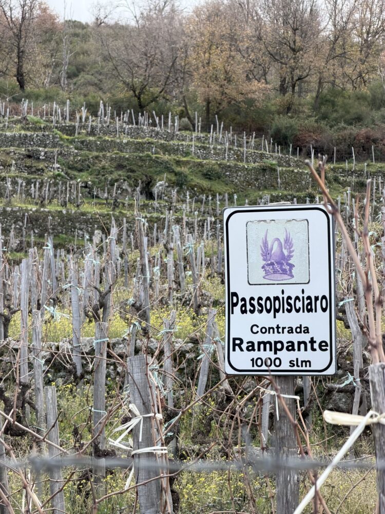 Tra un muretto a secco e una mulattiera, il giro prosegue. Oggi Passopisciaro S.r.l. annovera tra le sue referenze di contrada cinque rossi e un bianco. La proprietà adesso ha diversi ettari, di cui 11 in affitto al ungo termine. Il cuore della produzione è il nerello mascalese, vitigno a bacca scura principio del Vulcano, ma oltre ai sopra citati non mancano vigne dedicate alla produzione dello Chardonnay. Quest’ultimo vitigno è coltivato anche più in alto di altri (alcuni ettari arrivano anche ai 1.000 metri di altitudine), così da poter beneficiare delle escursioni termiche che ci sono a certe altitudini sul versante Nord (basti pensare che a settembre la differenza tra giorno e notte arriva anche a toccare i 20°). E mentre le uve di altitudini più elevate confluiscono nella contrada PC, le altre – provenienti anche da Montedolce, risalenti al 2009 e al 2020 – diventano Passobianco.