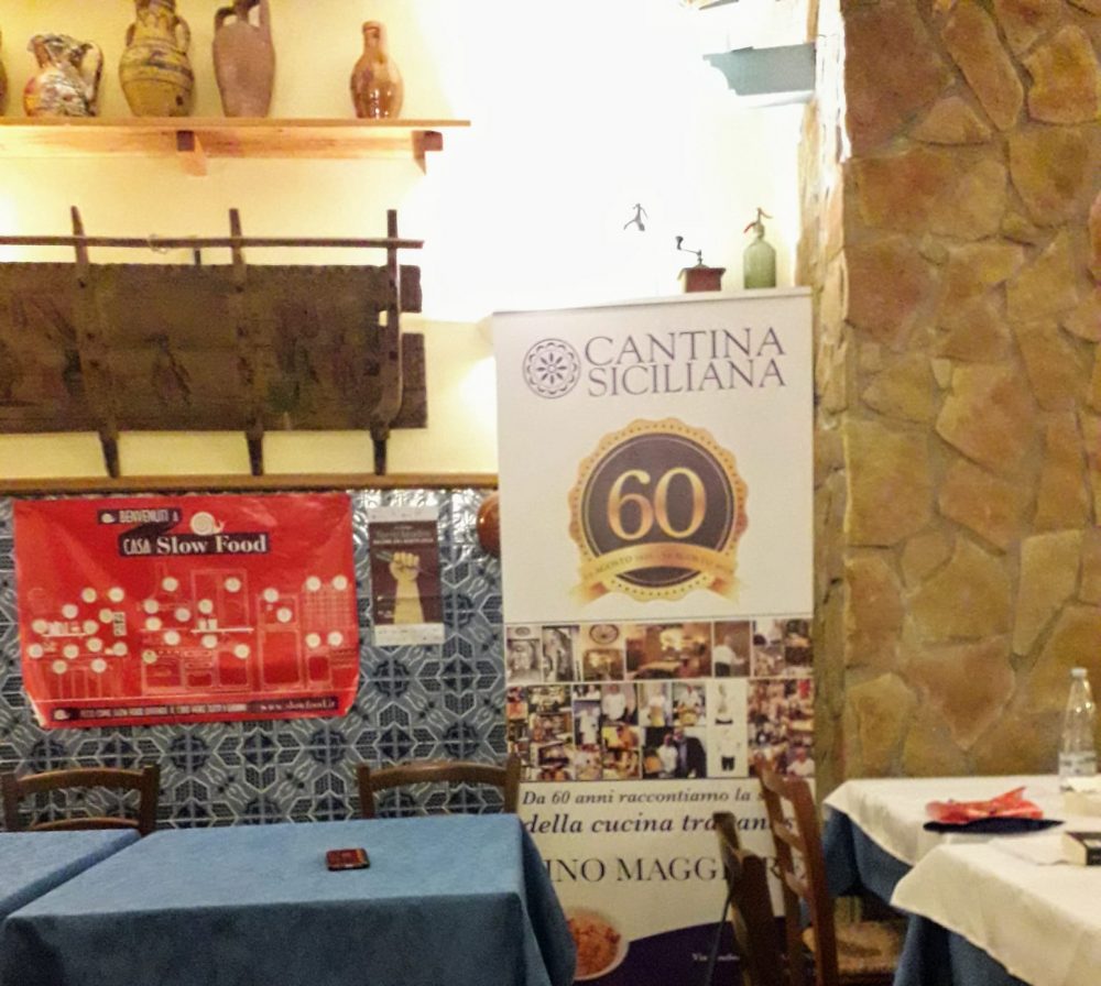 In Sicilia, di fronte alla Tunisia, in un antico quartiere ebraico. Precisamente a via della Giudecca, in pieno centro storico a Trapani. Cantina Siciliana è uno dei ristoranti più famosi della città, dove è nata il 13 agosto 1958. Quest’anno le candeline sono 60 e la storia del posto si mantiene intatta. Il blu sgargiante delle maioliche del locale ricorda le vicine terre tunisine, le ruote dei carretti appesi usati come insoliti lampadari e i pupi rimarcano le origini siciliane, le collezioni di ferri da stiro e i macinini da caffè, i Bambini Gesù e le Madonne in ceroplastica riempiono l’ambiente di quel barocco che è proprio di quest’isola. Pino Maggiore, proprietario di Cantina Siciliana dal 1980 è la memoria storica del suo ristorante, di quello che c’è stato prima e dopo il suo arrivo.