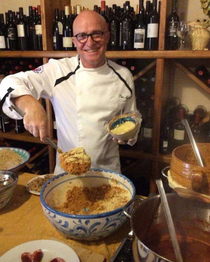 Negli occhi ha il vissuto di un uomo attivo e, al tempo stesso, l’energia di chi ha sempre voglia di fare. Il suo obiettivo, in primis, è quello di fare conoscere la cucina trapanese in ogni posto del mondo. Da grande cultore la prepara, la conserva, la rivisita e la esporta ovunque.