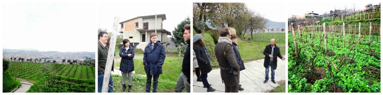 la vigna dei Camaldoli di Cantine Astroni; da sx, Luciano, Emanuela Russo, Alberto Capasso e Vincenzo Varchetta; Gerardo Vernazzaro; Guyot di Piedirosso, prima della legatura