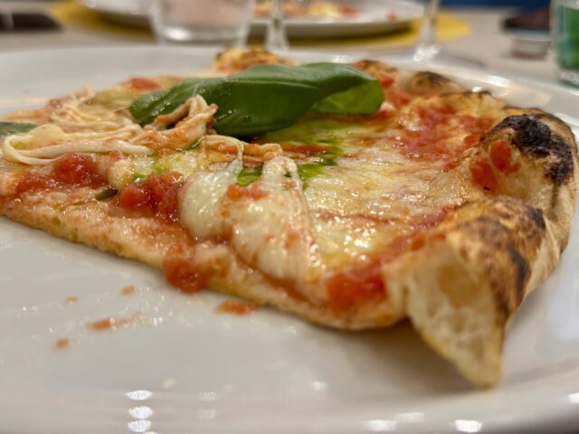 La proposta gastronomica ruota intorno a una pizza contemporanea napoletana, realizzata con un impasto che rivela conoscenza tecnica e attenzione. Merito del percorso formativo di Carlo De Luca, che può vantare esperienze significative accanto a nomi importanti della pizza campana, come Salvatore Lioniello, dove ha affinato le sue competenze tra banco e forno. La sua pizza é ben eseguita, senza sbavature, con una gestione consapevole di autolisi, lievito e fermentazione, che si traduce in leggerezza, equilibrio e struttura. Cornicione evidente e base scioglievole, il panetto sfiora i 280 grammi.