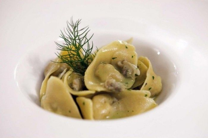Cappellacci ripieni di spigola e finocchi in guazzetto di vongole veraci e broccoli vesuviani