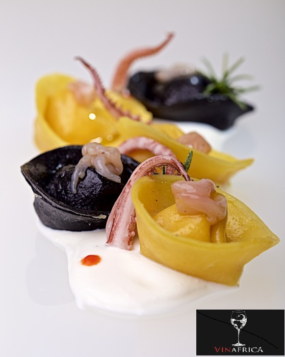In un piatto piano bianco lucido adagiare sul fondo due cucchiai di salsa di provola, disporre in bellavista i cappellacci tre per ogni colore, aggiungere dei puntini di salsa al rosmarino, guarnire con rametti di rosmarino e i tentacoli di totano.