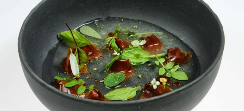 Mettere il brodo in infusione a freddo con il basilico, l’origano e la maggiorana spezzati grossolanamente. Lasciare in infusione per 2 ore, filtrare il tutto con uno chinois e mantenere in fresco per il servizio.