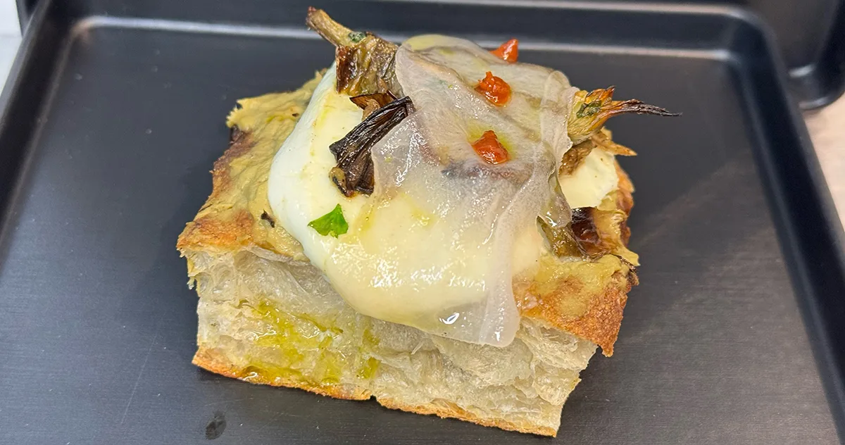 Gennaro Pepe della Pizzeria I Vesuviani a Pomigliano d’Arco (NA), partecipa a Fior… di Teglia 2023, iniziativa siglata 50 Top Pizza e Latteria Sorrentina, con Carcioffola.