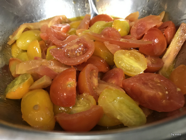 Ci sono i pomodori datterino cotti a vapore, la mozzarella di bufala campana Dop che vanno in forno sul disco.