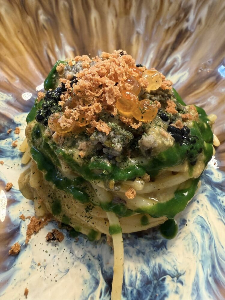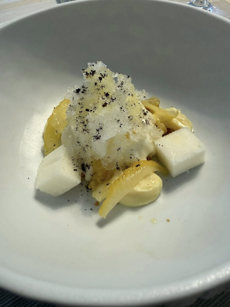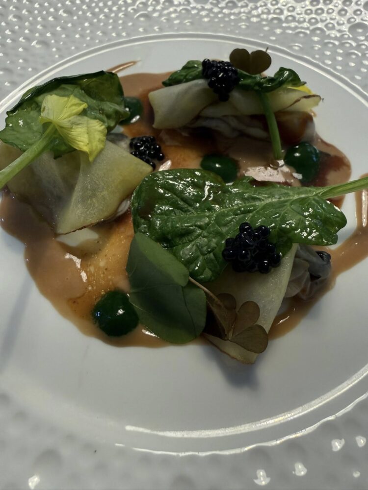 Carèm – Normandia – Ostrica Gillardeau, tare di ostrica, jus di agnello, lattuga di mare, pesto di seme di zucca, bottarga di carote