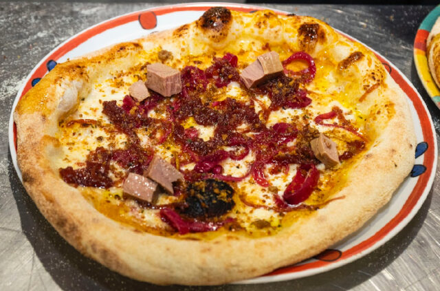 Gli ingredienti della farcia sono una base di crema di pomodorini gialli del Piennolo, tonno rosso delle Antiche Conserve della Marineria Gallo, cipolla al lampone e cipolla caramellata, mollica fritta aromatizzata al limone sfusato amalfitano, zest di sfusato amalfitano e olio al limone. Pizza, questa, presente nel menù della pizzeria Carlo Fiamma – Pizza e Cantina ad Amalfi nella sezione “La mia identità” al costo di 16 €.
