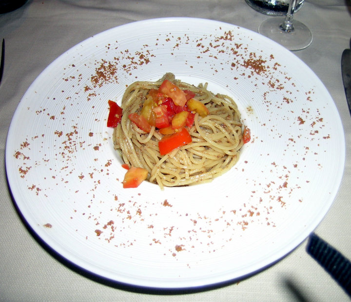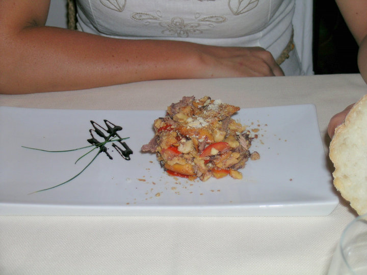 Ma eccolo finalmente in tavola. Per aprire, il filetto di tonno, il musciamme, trattato come un salume, condito con un filo d’olio ed un goccio di aceto balsamico, sapidità spinta sapientemente bilanciata dai facussa, i simpatici cetrioli locali; poi insalata di cuore di tonno e cappunadda, la tradizionale galletta bagnata con olio ed aceto e farcita con buzzonaglia di tonno, facussa e pomodorini: semplice quanto gustosa!