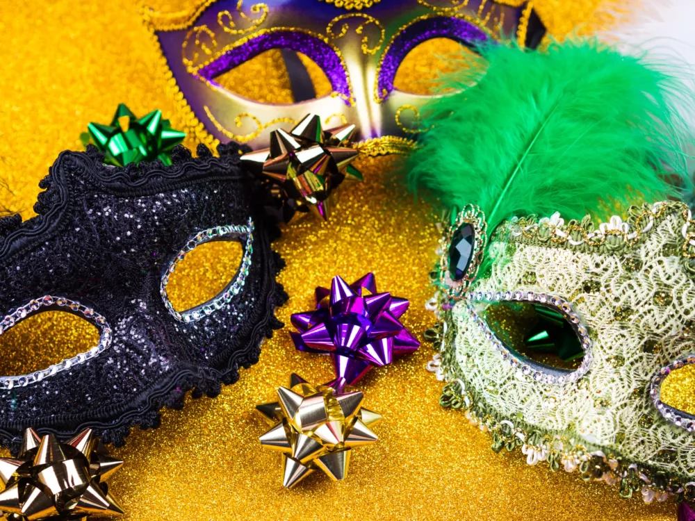 Colorful mardi gras carnival masks on golden glitter background. Festive holiday still life flat lay
