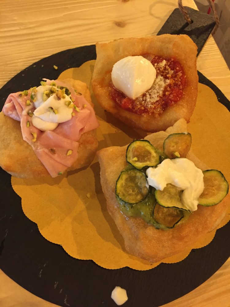 Emilio è uno che si è preparato bene prima di dar vita alle sue pizzerie (perché ne ha più di una), a cominciare dagli impasti, alla ricerca delle materie prime, fino a mettere a punto le combinazioni giuste dei topping. Prima di tutto, il menu si apre con la carte degli oli, cosa non di poco conto, con preferenza di monocultivar 100% abruzzesi del Comune di Pianella. L’assaggio si apre con i classici fritti in stile napoletano ed un tris di montanarine dall’impasto soffice e leggero, che aprono piacevolmente ai piatti successivi.