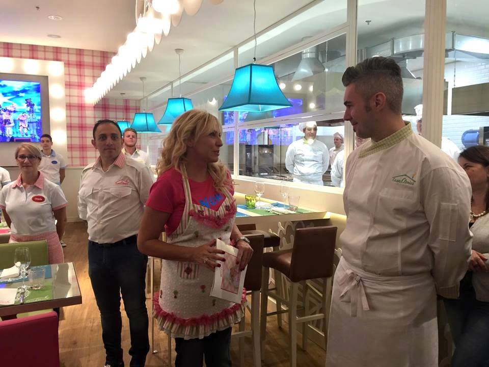 “Un progetto a mia immagine e somiglianza in cui c’è il cuore, l’anima, il sentimento.Questo ristorante è proprio come la mia casa, ho messo i miei vestiti, le mie cose, tutto nei colori che volevo. Un ambiente nuovo ed unico, dove tutto quello che vedete può essere anche acquistato, un format di ispirazione anglosassone, rappresentato dall’area merchandising, ma con il cuore italiano. Ho scelto Caserta, perché da donna del Nord volevo investire qui, mi sembrava giusto dare una spinta al nostro Sud Italia che tanto amo. Il Sud che da anni segue sempre con affetto i miei programmi. È stata una scelta ben precisa. Io sono venuta a vedere questo centro commerciale, mi è piaciuto ed ho detto: è il posto dove aprire il mio primo ristorante. In un centro commerciale perché vogliamo rivolgerci ad un pubblico popolare, familiare. Il nostro scontrino ha 15 euro di media, vogliamo sia accessibile a tutti. Si può venire in qualsiasi ora del giorno per mangiare quello che si pensa di trovare a casa mia, ad esempio: tanta pasta e niente pesce, non lo preferisco”.