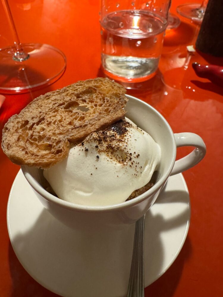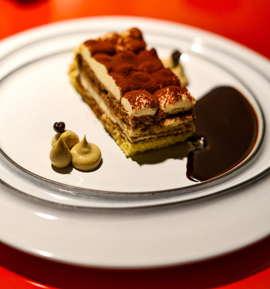 Il secondo è un agnello stracotto al caffè, sorprendente ma misurato, accompagnato da topinambur e spinacino, capace di unire intensità e delicatezza. I dolci chiudono il percorso con un ritorno alla comfort zone: tiramisù classico, semifreddo agli agrumi e crema di panettone, rassicuranti e ben eseguiti. Accanto alla carta, il ristorante propone due menù degustazione.