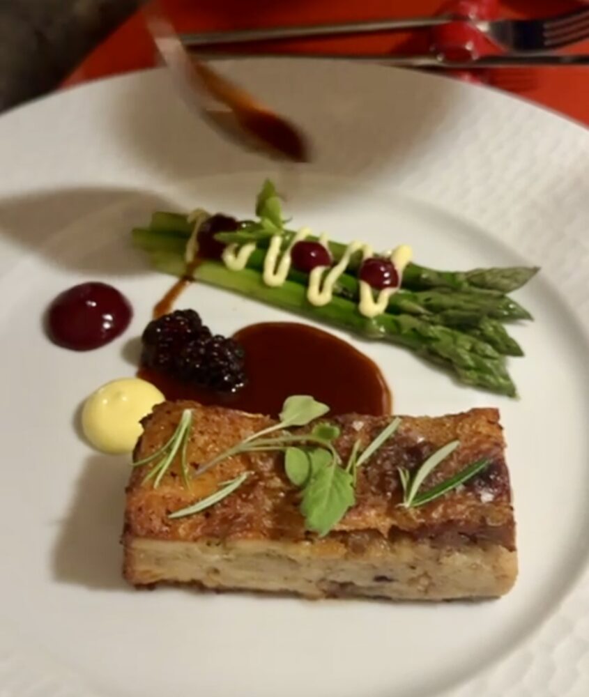 Ed è proprio questo che cambia la percezione del luogo. In una cornice bellissima come quella di Casa del Nonno 13, oggi si può tranquillamente trascorrere un paio d’ore, bere un drink, aprire una buona bottiglia di vino e accompagnarla con una sessione di salumi e formaggi, senza per forza intraprendere un percorso gastronomico completo. Un modo nuovo, più libero, di vivere uno spazio che per anni è stato percepito come impegnativo. Questa apertura rende il ristorante adatto a pubblici diversi: a chi cerca una cucina più ricercata, ma anche a gruppi di amici che vogliono ritrovarsi per mangiare in modo più easy o semplicemente condividere un tagliere fatto come si deve. È un passaggio culturale importante, perché se un tempo la stella Michelin e la solennità della dimora storica potevano intimorire, oggi quello stesso palazzo racconta accoglienza, possibilità e quotidianità. La cucina, del resto, lo conferma. Per quanto i piatti siano armoniosi, curati ed eleganti nella presentazione, restano profondamente legati a una cucina povera, di tradizione, schietta, che non si allontana mai dal territorio.