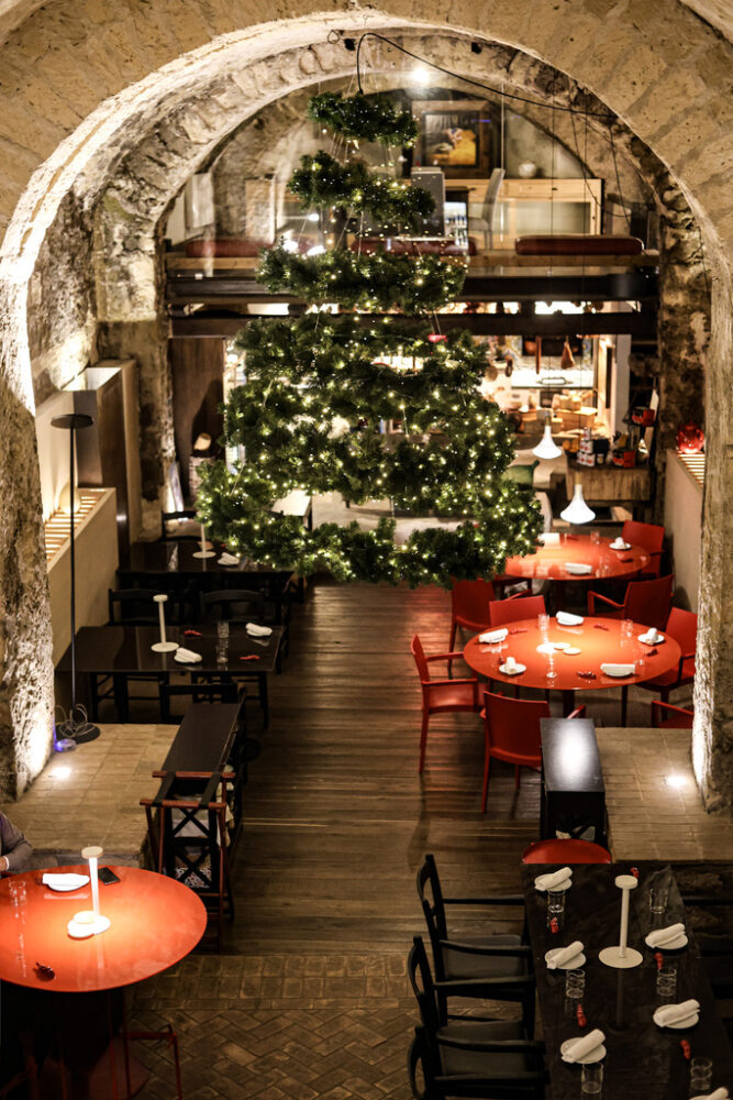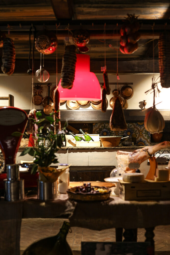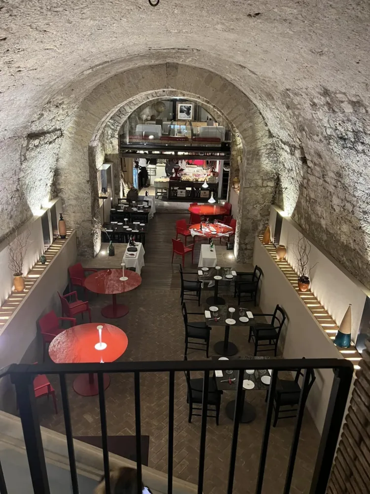 L’ambiente è sempre suggestivo, i tavoli rossi hanno sostituito quelli in legno dando un giusto tocco di contrasto fra antico e moderno, fuori una corte dove si mangia quando è buon tempo, la cantina segreta a cui si accede attraverso un cunicolo, poi una sala per piccoli eventi e banchetti con sfogo nel giardino. Il Palazzo del ‘700 è insomma un vero e proprio labirinto in cui è bello perdersi.