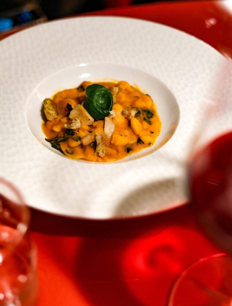 La pasta del Pastificio Vicidomini accoglie poi un piatto profondamente campano, con fagioli cannellini, cicoria selvatica, trippa e peperoncino, completato da note affumicate di cenere, lenticchie soffiate e caciocavallo irpino.