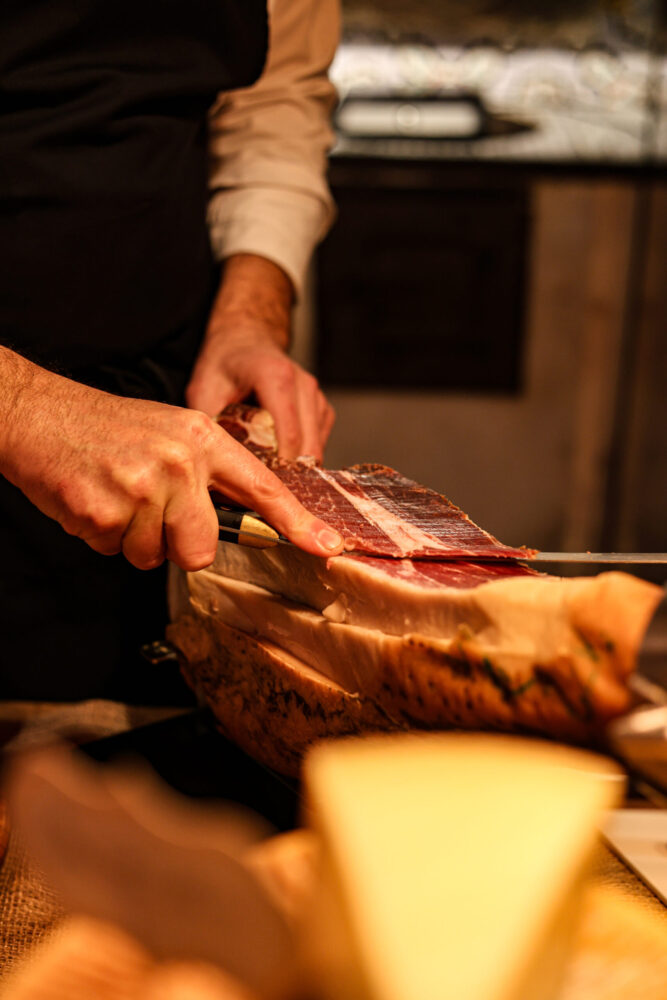 Casa del Nonno 13 è aperta per una cena strutturata, certo, ma oggi si può entrare anche semplicemente per una degustazione di formaggi o per un calice di vino. La vera novità è il Banco di Salumi e Formaggi, un angolo vivo e conviviale dove è possibile vedere lo chef all’opera mentre affetta con cura, seleziona e compone taglieri davvero particolari, costruiti esclusivamente con prodotti territoriali scelti uno a uno. Un gesto antico, quasi domestico, che restituisce valore al tempo e alla materia prima.