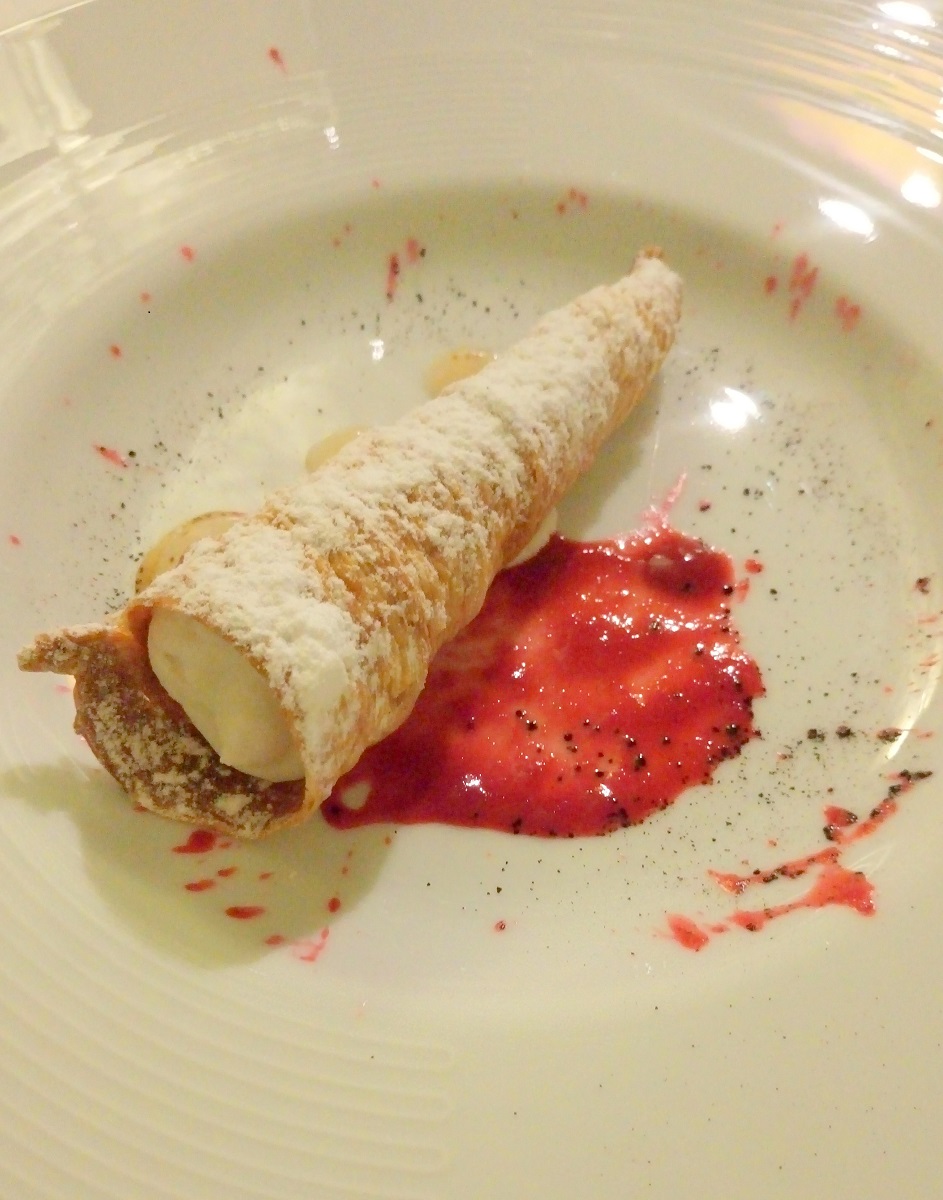 - Cornetto di sfogliatella riccia ripieno di ricotta di bufala mantecata, salsa di pere e liquirizia.