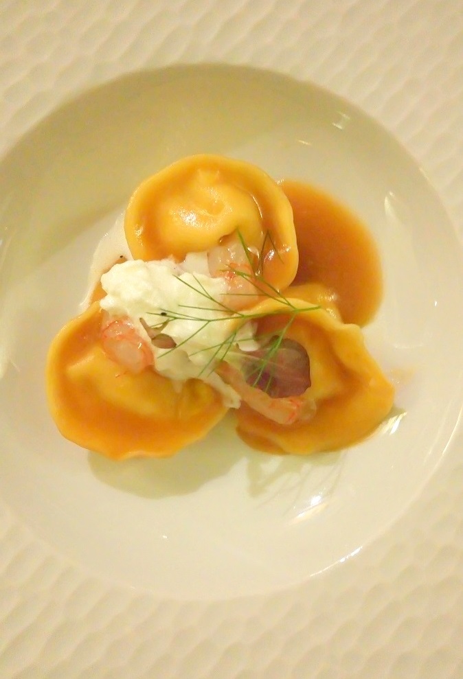 - Cappellacci di gamberi rossi, lemongrass, bisque e burrata.